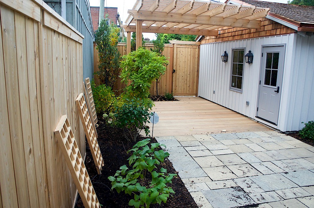 A new pergola with cedar decking, pyramidal oak replace the dead hornbeams